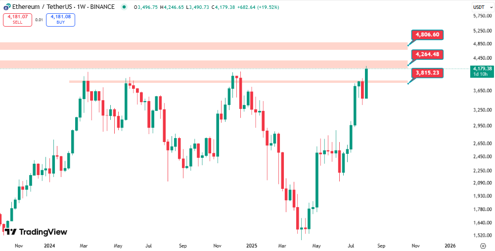 با وجود اینکه قیمت اتریوم (ETH) در حال حاضر حوالی ۴۱۹۶ دلار و ۱۴ درصد پایینتر از رکورد تاریخی خود است، اما در یک ساختار صعودی قوی قرار گرفته و با ارزش بازاری معادل ۵۰۶.۱۴ میلیارد دلار، به سمت اهداف بالاتر حرکت میکند.