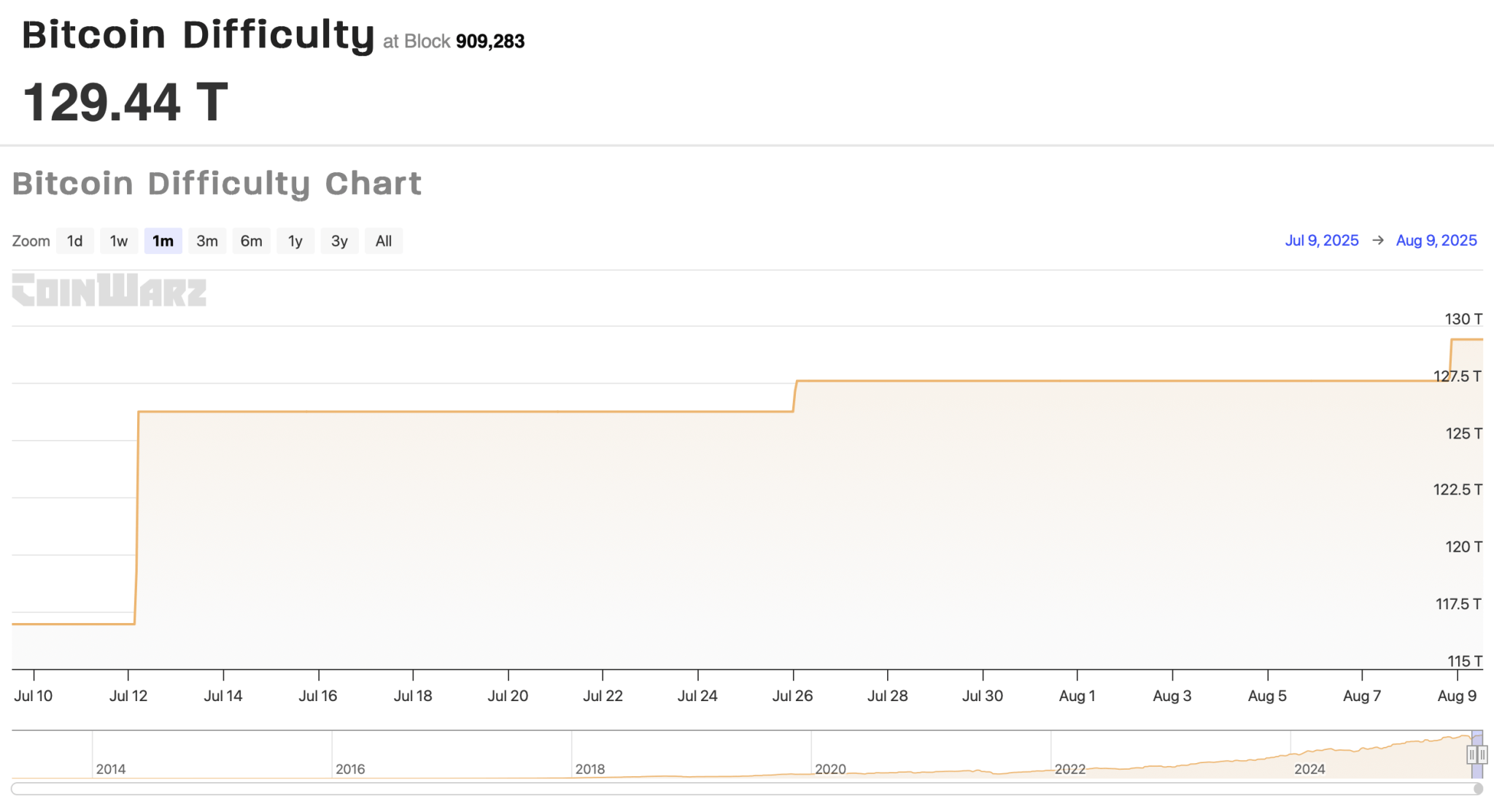 سختی استخراج بیت کوین پس از این تنظیم در ارتفاع بلوک ۹۰۹ هزار و ۲۱۶، عدد شاخص سختی استخراج به ۱۲۹.۴۴ تریلیون رسید که بالاترین رقم در تاریخ شبکه محسوب میشود. این عدد نشاندهنده میانگین تعداد هشهایی است که ماینرها برای کشف موفقیتآمیز یک بلوک جدید باید محاسبه کنند.