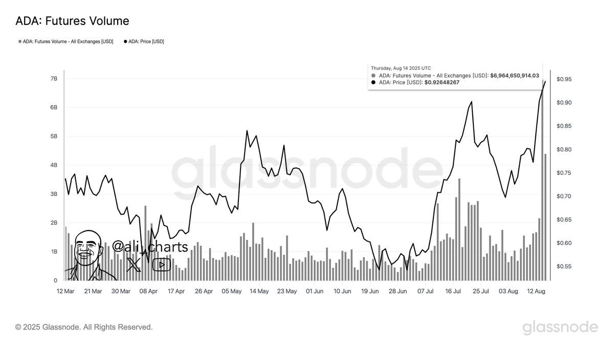 علی مارتینز (Ali Martinez)، تحلیلگر مشهور ارزهای دیجیتال، معتقد است اگر روند صعودی ادامه پیدا کند، قیمت کاردانو میتواند در هفتههای آینده تا محدوده ۱.۵۰ دلار افزایش یابد. او در پستی اعلام کرد که حجم معاملات آتی کاردانو با افزایش به ۶.۹۶ میلیارد دلار، به بالاترین سطح در پنج ماه گذشته رسیده است. از نظر تاریخی، افزایش فعالیت در بازار آتی اغلب پیشدرآمدی برای حرکتهای قوی در قیمت است.