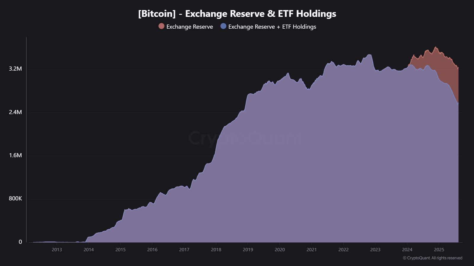 معمولاً کاهش ذخیره صرافی‌ها به عنوان نشانه‌ای از کمبود عرضه و افزایش صعودی قیمت تلقی می‌شود. اما کریپتو کوانت توضیح داد که با راه‌اندازی صندوق‌های معاملاتی نقدی بیت کوین در ایالات متحده از ابتدای سال گذشته، تصویر بازار تغییر کرده است. نمودار ارائه شده نشان می‌دهد که در حالی که ذخیره صرافی‌ها کاهش یافته، دارایی‌های صندوق‌های ETF افزایش مشابهی داشته است.