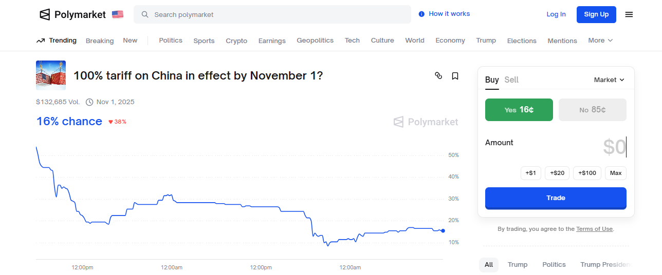 دادههای وبسایت پیشبینی پالیمارکت (Polymarket) نشان میدهد احتمال اعمال تعرفه ۱۰۰درصدی ایالات متحده علیه چین تا تاریخ ۱ نوامبر ۲۰۲۵ به ۱۶ درصد کاهش یافته است. این رقم نسبت به روزهای گذشته حدود ۳۸ درصد افت کرده و نشاندهنده کاهش انتظارات معاملهگران از تشدید جنگ تجاری میان دو قدرت اقتصادی جهان است.