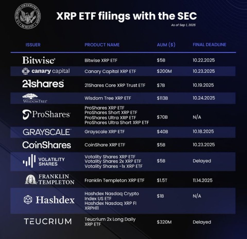شش پرونده ETF اسپات ریپل در انتظار تصمیم نهایی SEC بین تاریخهای ۱۸ تا ۲۵ اکتبر قرار دارند. در میان آنها، تصمیم درباره صندوق شرکت گریاسکیل (Grayscale) این هفته اعلام خواهد شد و درخواستهای ۲۱شرز (21Shares)، بیتوایز (Bitwise)، ویزدومتری (WisdomTree)، کوینشیرز (CoinShares) و کنری کپیتال (Canary Capital) هفته آینده بررسی میشود.
