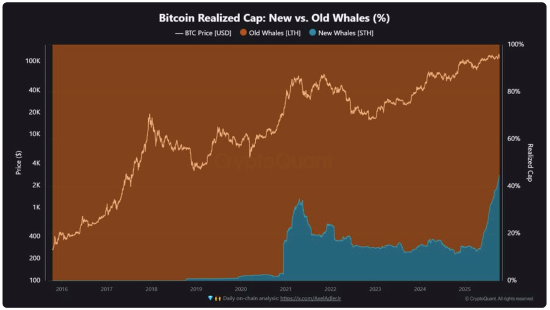 بهطور همزمان، سهم دارندگان کوتاهمدت (STH) از ارزش تحققیافته شبکه به ۴۴ درصد رسیده است؛ رقمی که در چرخههای پیشین با فاز نهایی بازارهای گاوی همزمان بوده است. طبق توضیح کریپتوکوانت، این تغییر نشان میدهد سرمایهگذاران قدیمی در حال فروش داراییهای خود به تازهواردها هستند.