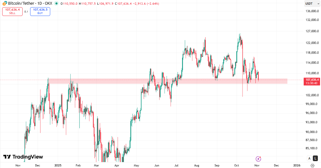 قیمت بیت کوین در آستانه رسیدن به حمایت سرنوشتساز ۱۰۶ هزار دلاری