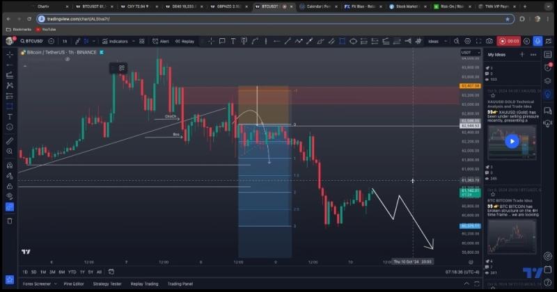 📌۱- سناریوی اول: (تصویر نزولی بالا)☝🏼سیگنال معاملاتی شورت در تایم فریم یک ساعته دیده میشه، که معامله گرآ میتونن معاملات فروش خودشون و باز کنن و در 61555.0 بفروشن و بصورت پله ای اهداف زیر و دنبال کنند .