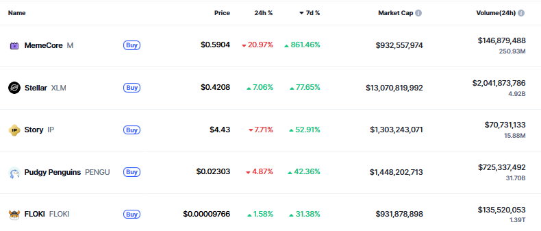 قطعاً بیتکوین در این هفته یکی از ارزهای دیجیتال صعودی باقی ماند، اما میمکور (Memecore) (با نماد M) به بزرگترین رشد کننده بازار کریپتو تبدیل شد. این ارز با رالی بیش از ۸۰۰% در طول هفته، در حال حاضر با قیمت ۰.۵۹ دلار و ارزش بازاری نزدیک به یک میلیارد دلار معامله میشود. استلار (XLM) دومین رشد کننده بزرگ با رالی ۷۷% در طول هفته و ۷% در امروز است که در حال حاضر با قیمت ۴.۱ دلار معامله میشود.