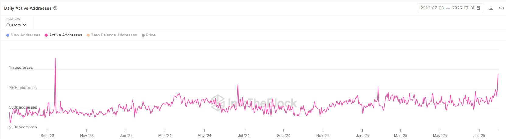 حتی با سقوط بازار کریپتو در امروز، علاقه به اتریوم کاهش نیافته است. آخرین دادههای Sentora (که قبلاً IntoTheBlock بود) نشان میدهد تقریباً ۹۳۱,۰۰۰ کیف پول در روز پنجشنبه (۳۱ جولای) ETH جابجا کردهاند، سطحی که از سپتامبر ۲۰۲۳ تا کنون ثبت نشده بود. (در حال حاضر، طبق YCharts، تعداد آدرسهای فعال روزانه اتریوم در ۲۹ جولای ۲۰۲۵، ۶۷۱,۴۲۳ واحد بوده است. این اختلاف در اعداد ممکن است به دلیل روشهای مختلف جمعآوری داده یا بازههای زمانی گزارشدهی باشد. با این حال، روند کلی افزایش فعالیت آدرسها همچنان مشهود است.)
