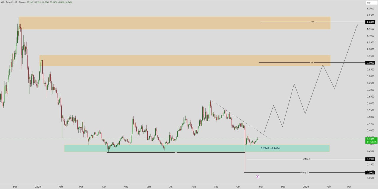 ارز ARB در تایم فریم روزانه بعد از ریزش اخیرش که تمام نقدینگی های زیر کف آخر رو جمع کرده بالای ناحیه حمایتی 0.2943 الی 0.2434 تثبیت داده و با حفظ این ناحیه و شکستن خط روند نزولیش میتونه مسیر خودش رو برای رسیدن به تارگت های 0.9 و 1.2 دلار هموار کنه.