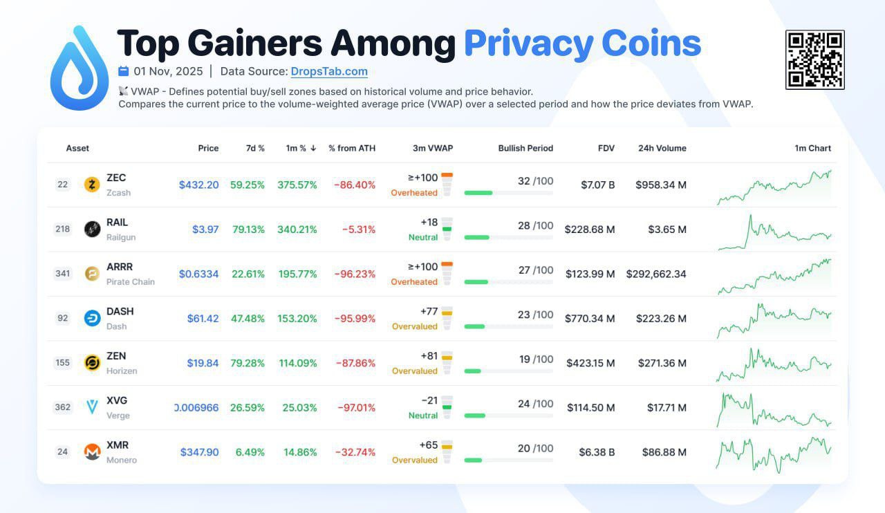 تا اینجای کار، گروه Privacy Coin,تاپ گینر بازار کریپتو در ماه گذشته بودن و لیدر این گروه یعنی پروژه Zcash،تو اکتبر 375% رشد کرده.