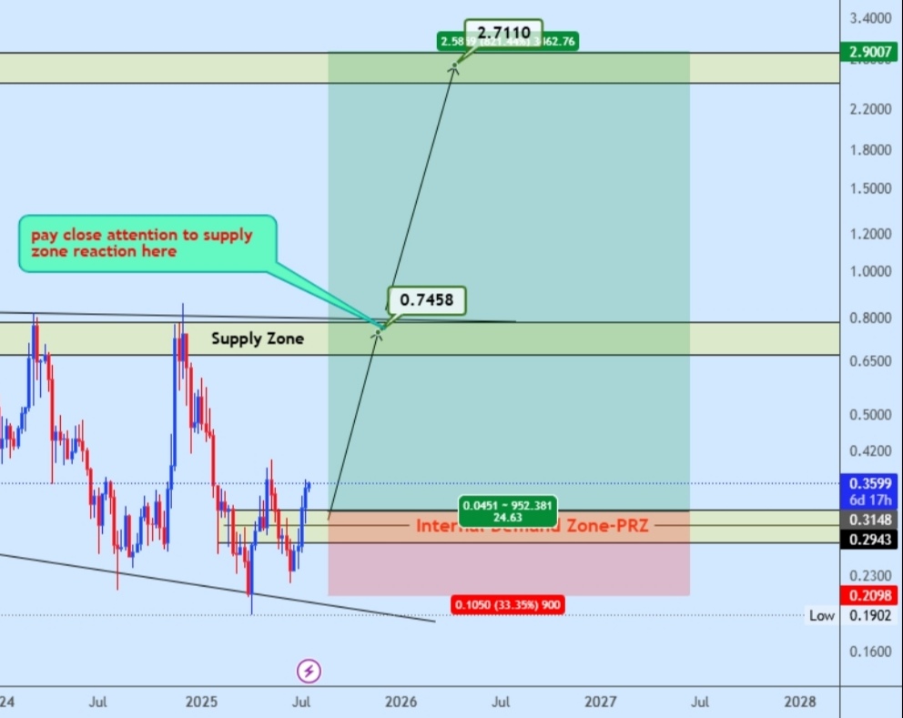 از طرف دیگه مومنتوم، افزایش قیمت به سمت منطقه عرضه 0.65 تا 0.80 دلار رو ترجیح میده، سطحی کلیدی که، قبل از این باعث فروشهای سنگین شده بود. شکست موفقیتآمیز بالای این ناحیه میتونه شتاب صعودی قابل توجهی رو برای رسیدن به « ناحیۀ هدف 2.70 دلار » ایجاد کنه.