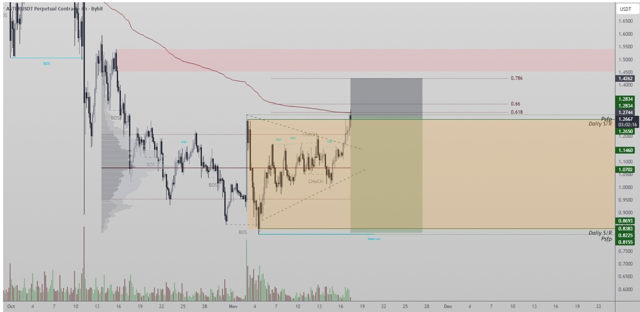 قیمت فعلی: 1.14 دلاربعد از یک روند نزولی طولانی مدت، ASTER نشونههای اولیه تثبیت رو بروز داده. قیمتها باید زیر 1.20 دلار جمع بشن. حرکت قیمت همچنان زیر میانگین متحرک 200 روزه قرار داره، که بیانگر اینه که «ساختار کلی هنوز نزولیه، اما با شروع مسطحشدن میانگینهای متحرک کوتاهمدت، مومنتوم به تدریج در حال تغییره.