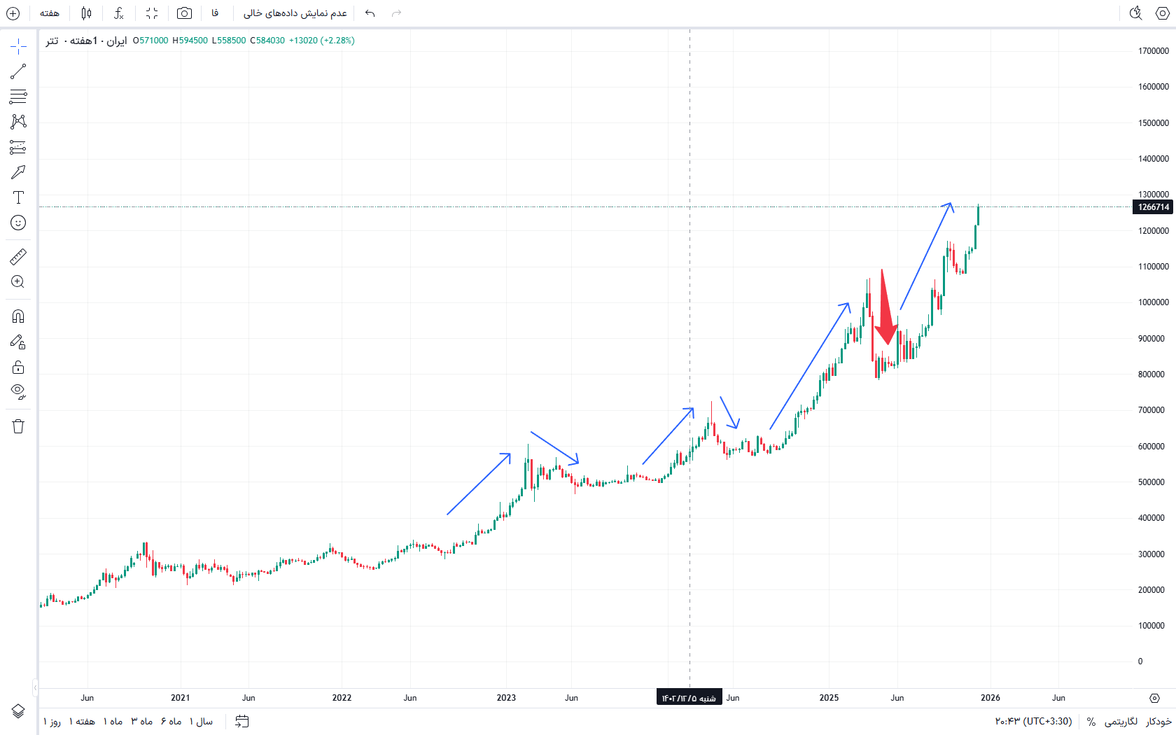 مطابق عکس و پیکان های کشیده شده در تایم فریم روزانه شیب حرکت های صعودی به مرور زمان کم شده است و این نشانه ی ضعف است. یعنی انتظار میرود یک اصلاح در حرکت تتر اتفاق بیفتد. آخرین حمایت که واکنش قابل توجهی روی آن اتفاق افتاده باشد روی قیمت 111000 تومان است و احتمال دارد به این قیمت برسد.