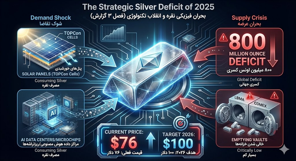 - کسری انباشته: در ۵ سال اخیر، بازار با ۸۰۰ میلیون اونس کمبود فیزیکی مواجه شده که منجر به تخلیه انبارهای بورسهای بزرگ (COMEX و LBMA) شده است.