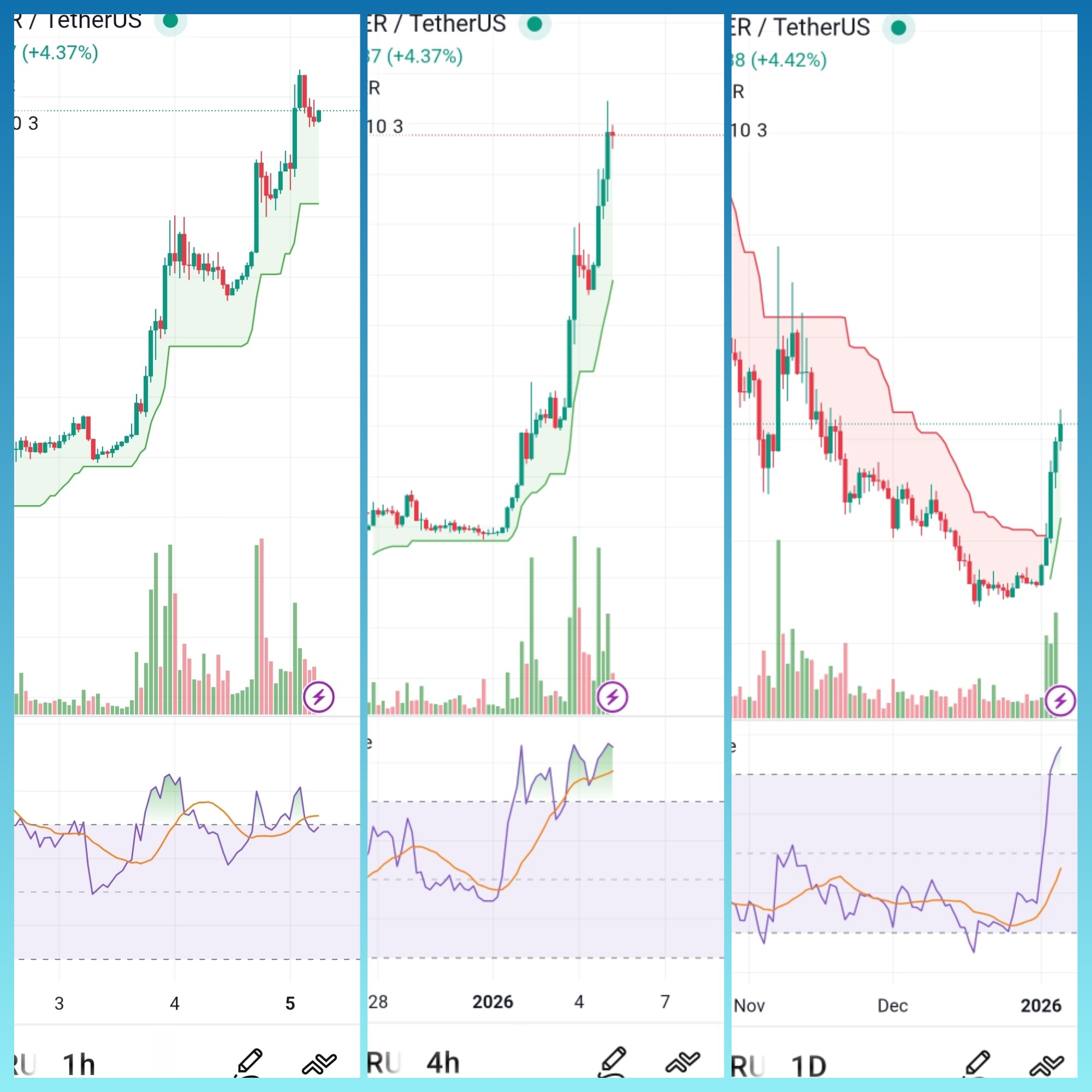 اما… اما در تایمفریمهای کوتاهمدت (۴ ساعته و ۱ ساعته) که باید کمی احتیاط کرد؛ چون با اشباع خرید در RSI (بالای ۷۰ و حتی ۸۰ ) روبرو هستیم. چون قیمت از خط حمایتی و میانگین Supertrend حوالی ۱.۷۸ تا ۱.۹۲ دلار، خیلی فاصله گرفته. در این مواقع معمولاً قیمت یه پولبک (بوسه خداحافظی با مقاومت شکسته شده) میزنه.