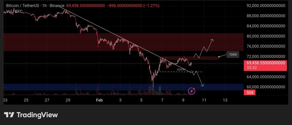 در حال حاضر باید منتظر شکست یکی از دو سطوح حمایتی و مقاومتیمون باشیم:با شکست سطح 72 هزار دلار و تثبیت قیمت بالای اون میتونیم انتظار رشد قیمت تا نواحی 78 الی 80 هزار دلار رو داشته باشیم (با گرفتن تاییدیه میتونید ورود کنید).