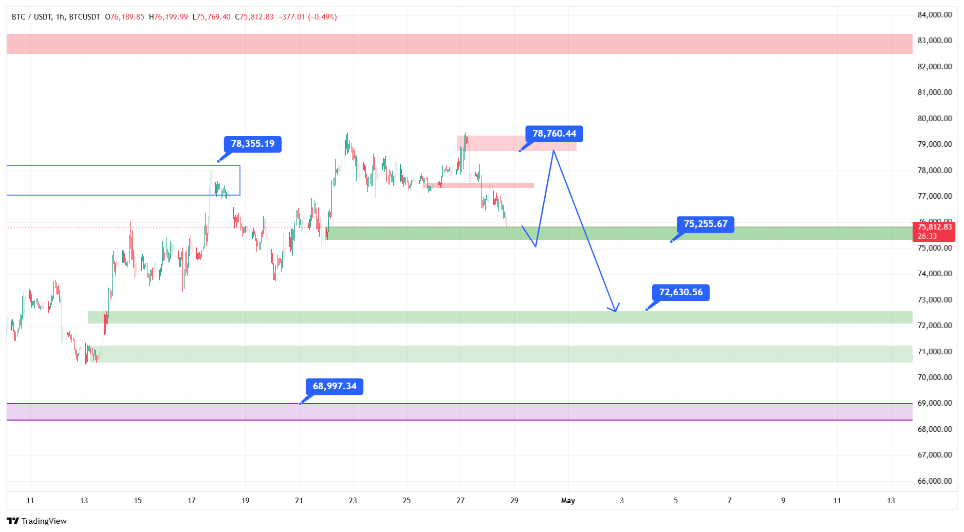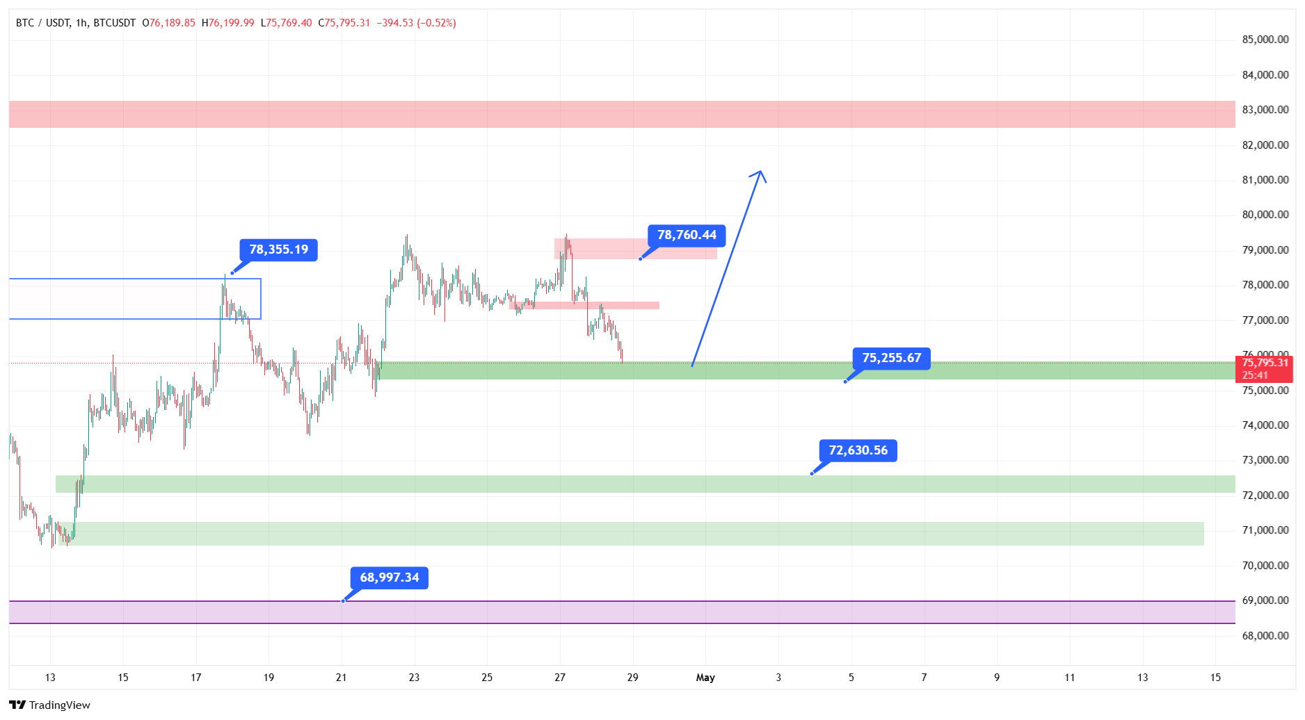اگر نفوذ به باکس سبز 75300 رخ دهد بازگشت تا ناحیه 78760 رخ خواهد داد و در ادامه تارگت 72500
